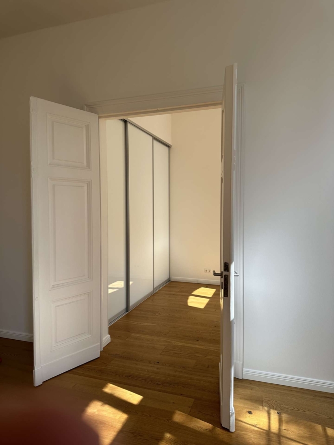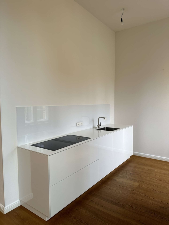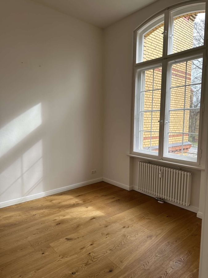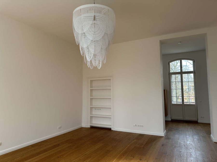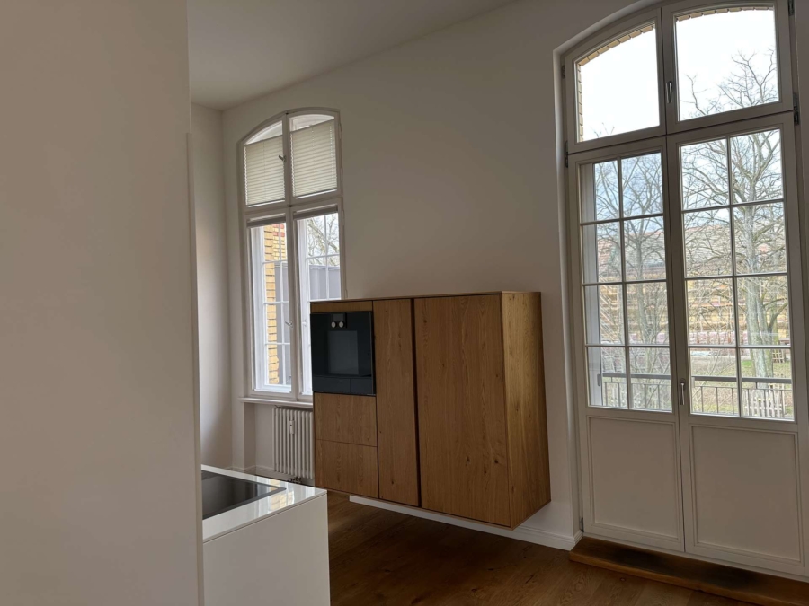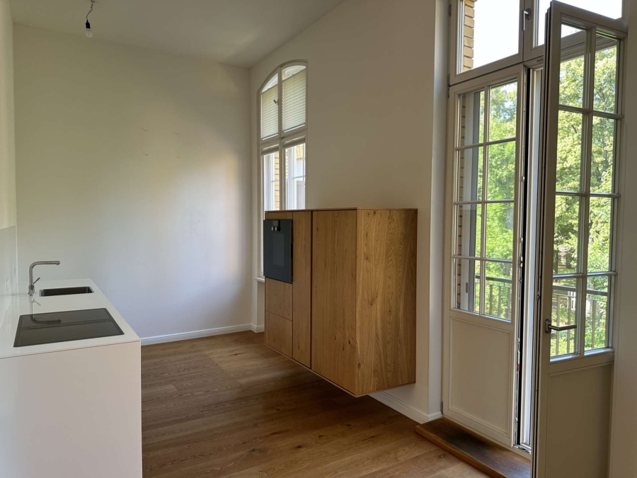 Die lichtdurchflutete Wohnung befindet sich im 1. Obergeschoss des Hauses. Sie verfügt über zwei geräumige Zimmer. Alle Zimmer nebst Küche und Flur sind mit Landhausdielen (Eiche) ausgestattet. Die Raumhöhen von bis zu ca. 4 Metern sorgen für ein großzügiges Raumgefühl.